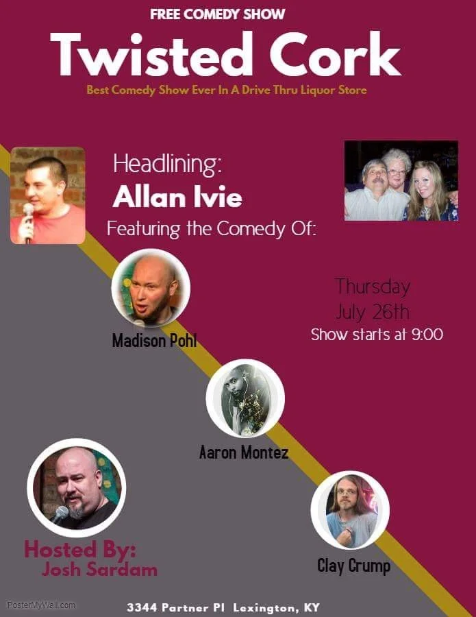 Poster for a free comedy show called Twisted Cork, happening on Thursday, July 26th, starting at 9:00 PM, at 3344 Partner Pl, Lexington, KY. The headliner is Allan Ivie, featuring comedians Madison Pohl, Aaron Montez, Clay Crump, and hosted by Josh Sardam. The poster includes photos of the performers and a small image of three people, possibly audience or friends.
