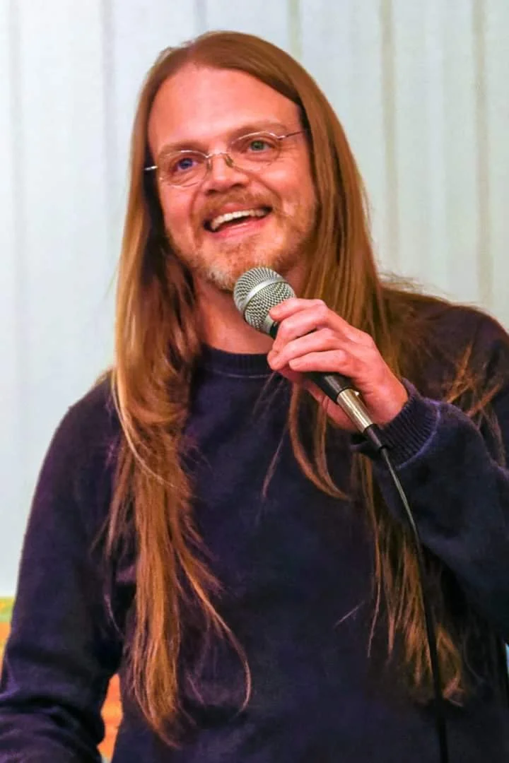 A man with long blonde hair, glasses, and a beard holding a microphone, smiling, wearing a dark long-sleeve shirt, standing indoors.