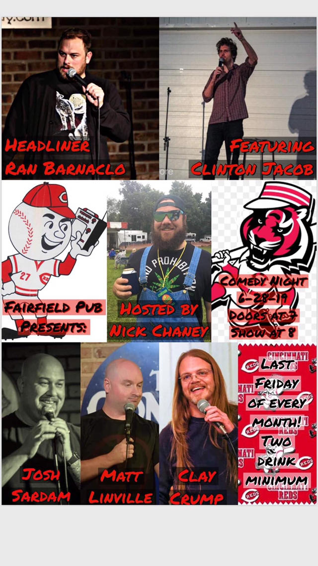 Collage featuring various comedians and the event details. Top left: a man with a microphone, captioned 'HEADLINER RAN BARNACLO'. Top right: a man with curly hair speaking into a microphone, captioned 'FEATURING CLINTON JACOB'. Middle left: cartoon character with baseball cap and camera, captioned 'FAIRFIELD PUB PRESENTS:'. Center: man with sunglasses and beard, captioned 'HOSTED BY NICK CHANEY'. Middle right: cartoon tiger in a hat, with details for comedy night on June 28, 2019, at DoorDash, with showtime at 8. Bottom row: three comedians, Josh Sardam, Matt Linville, and Clay Crump, each holding a microphone.