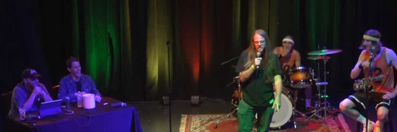 Live performance at a comedy show with a man doing comedy and a band playing instruments on stage with colorful lighting, and a panel of people seated at a table.