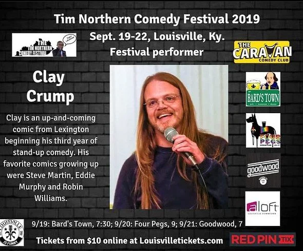 Poster for Tim Northern Comedy Festival 2019 featuring Clay Crump standing on stage with long hair and glasses, holding a microphone, promoting his stand-up comedy from September 19-22 in Louisville, Kentucky.