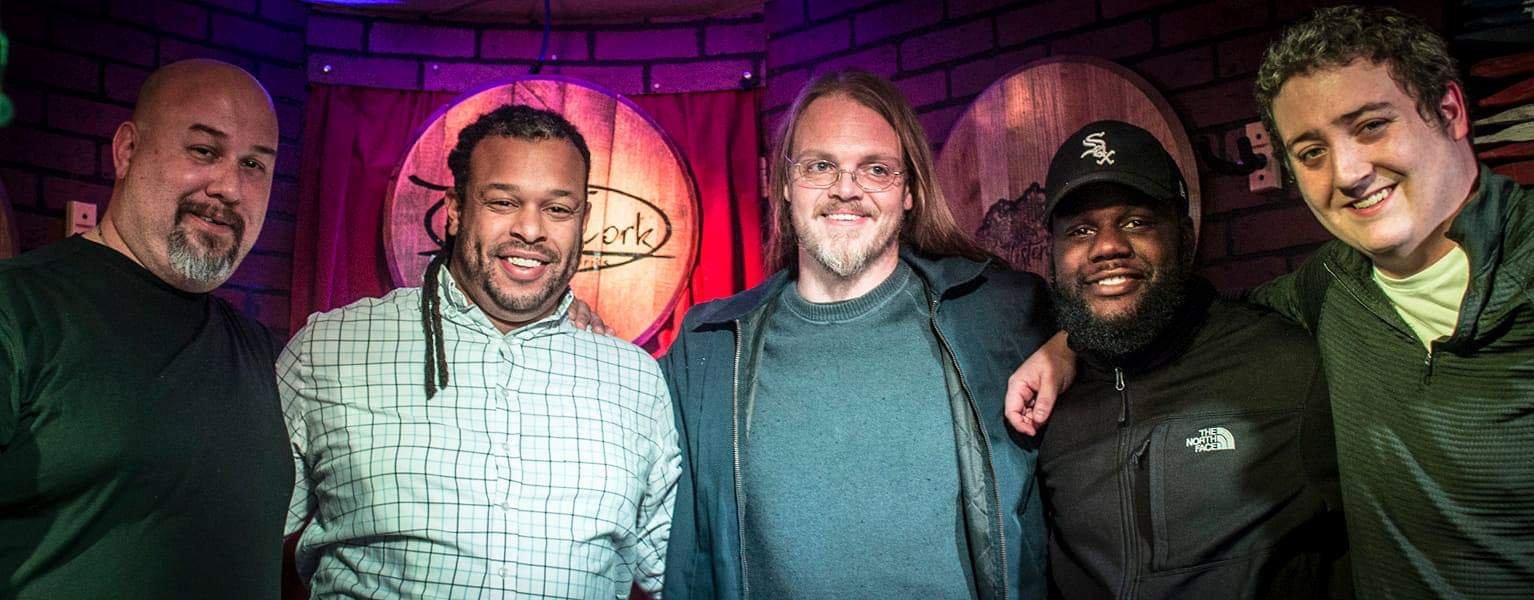 Group of five men standing together inside a comedy club, smiling at the camera.