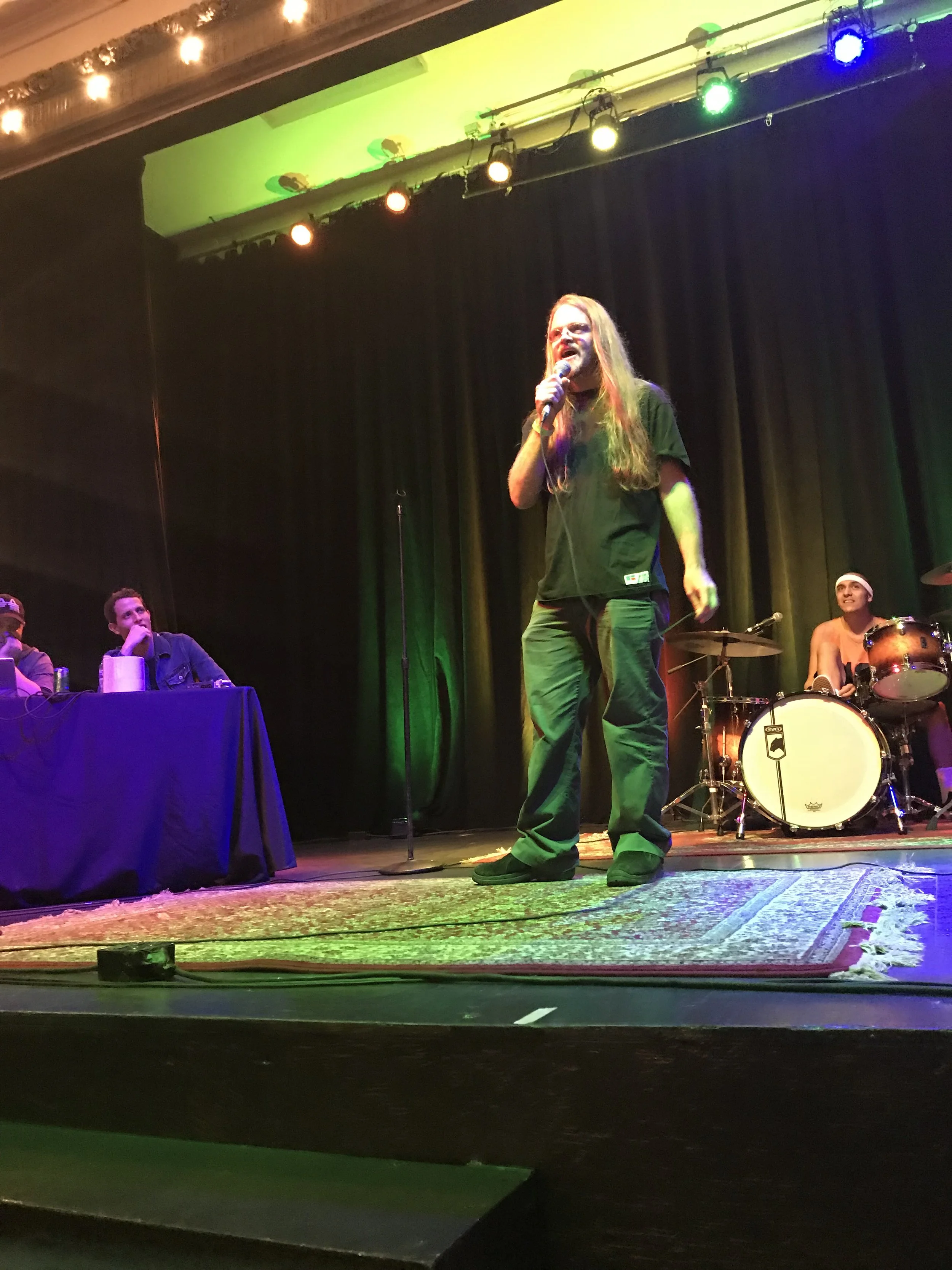 A man with long hair doing comedy into a microphone on stage, with a drummer behind him and a panel of people watching at a table to the left. The stage is decorated with colorful lights and a dark curtain in the background.