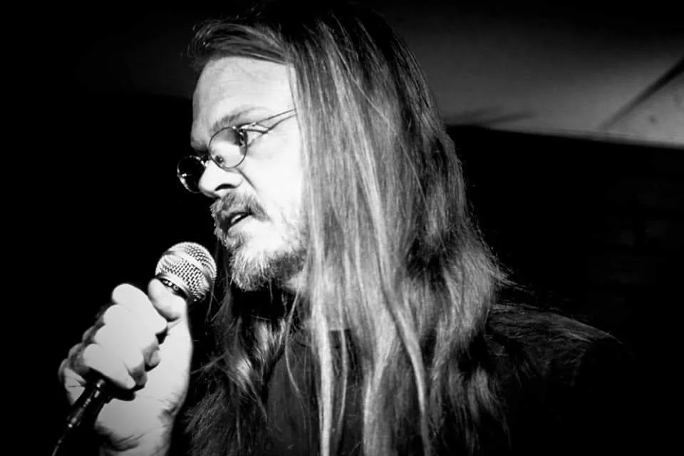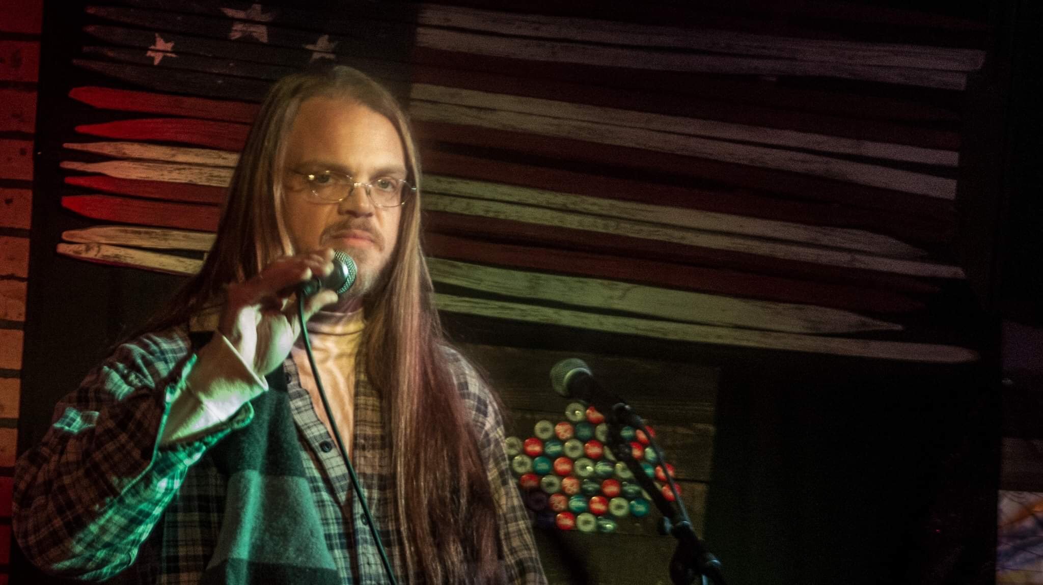 A man with long hair, glasses, and a beard holding a microphone on stage, with a background of stacked wooden planks and colorful bottle caps.