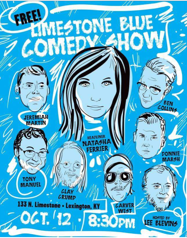 Blue promotional poster for Limestone Blue Comedy Show featuring headliner Natasha Ferrier, with photos of comedians Jeremiah Martin, Ben Collins, Tony Manuel, Clay Grump, Carver West, and Donnie Marsh, hosted by Lee Blevins, held at 133 N. Limestone, Lexington, KY on October 12th at 8:30 PM, with the word 'FREE!'